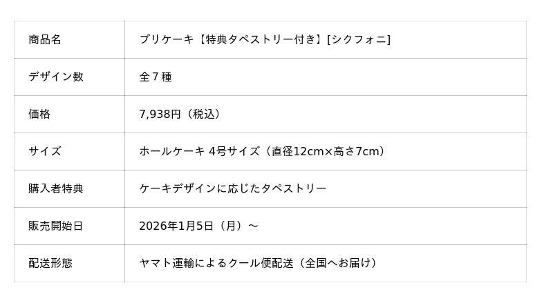 シクフォニは今回のプリロールとのコラボレーションを通じて、「祝う・共有する・残す」という体験を一つの形にしました。本商品はスイーツという身近な存在を通じて、誕生日や記念日といった大切な瞬間を形として残せる商品となっております。また、シクフォニのメンバー全員が実際にケーキを試食し、味わいや食べやすさにも配慮しました。見た目の華やかさだけでなく、最後まで美味しく楽しめる一台として、ファンの皆さまにお届けします。シクフォニが贈るオリジナルケーキに、ぜひご注目ください。