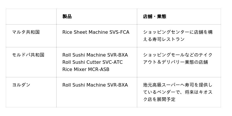 この度、欧州・中東・中央アジアに位置するマルタ、モルドバ、ヨルダンの3か国で、当社の米飯加工ロボットが新規導入されました。これにより、鈴茂器工の製品が活用されている国と地域の数は、世界94か国(2025年12月末時点)に拡大いたしました。今後も“SUZUMO”は、世界中の新たな地域において、当社の製品を通じて米飯食の“おいしさ”と“温かさ”をお届けし、日本の食文化の普及に貢献してまいります。