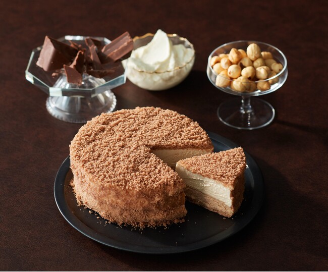 ベイクドチーズ層はクリームチーズとヘーゼルナッツペースト、ミルクチョコレートを組み合わせたナッティな味わい。さらにレアチーズムースにもヘーゼルナッツペーストを合わせ、ミルキーなマスカルポーネとの組み合わせが全体をより特別感のある味わいに仕上げました。