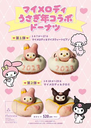 自然な素材にこだわる手作りドーナツ専門店「フロレスタ」に、今回は株式会社サンリオの大人気キャラクター「マイメロディ」「マイスウィートピアノ」そして「クロミ」の3キャラクターとコラボした『マイメロディうさぎ年コラボドーナツ』が登場します。