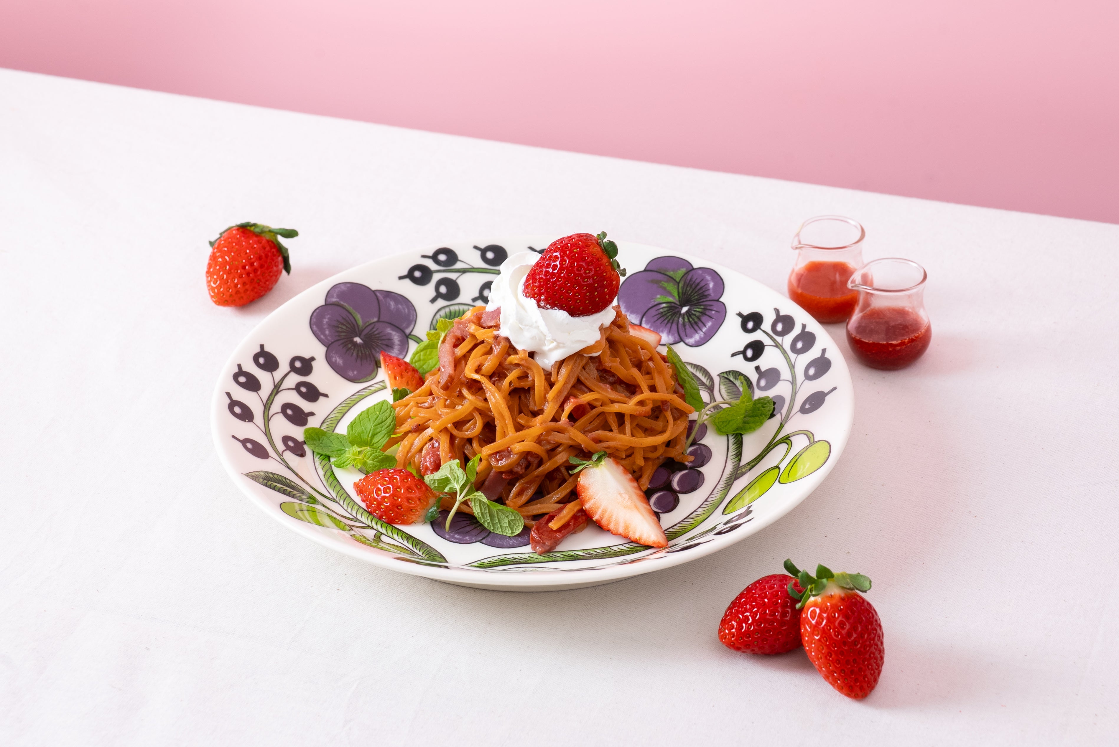 あまりんの魅力をお食事として味わう贅沢な一皿。いちごで炊いたピラフ、ミートボールのいちごジャム添え、いちごのナポリタン、いちごのサラダ。農家さんのアドバイスを元に開発した特製ソースが、料理の旨みを引き立てます。ここでしか味わえない、いちごの奥深いポテンシャルを体験してください。