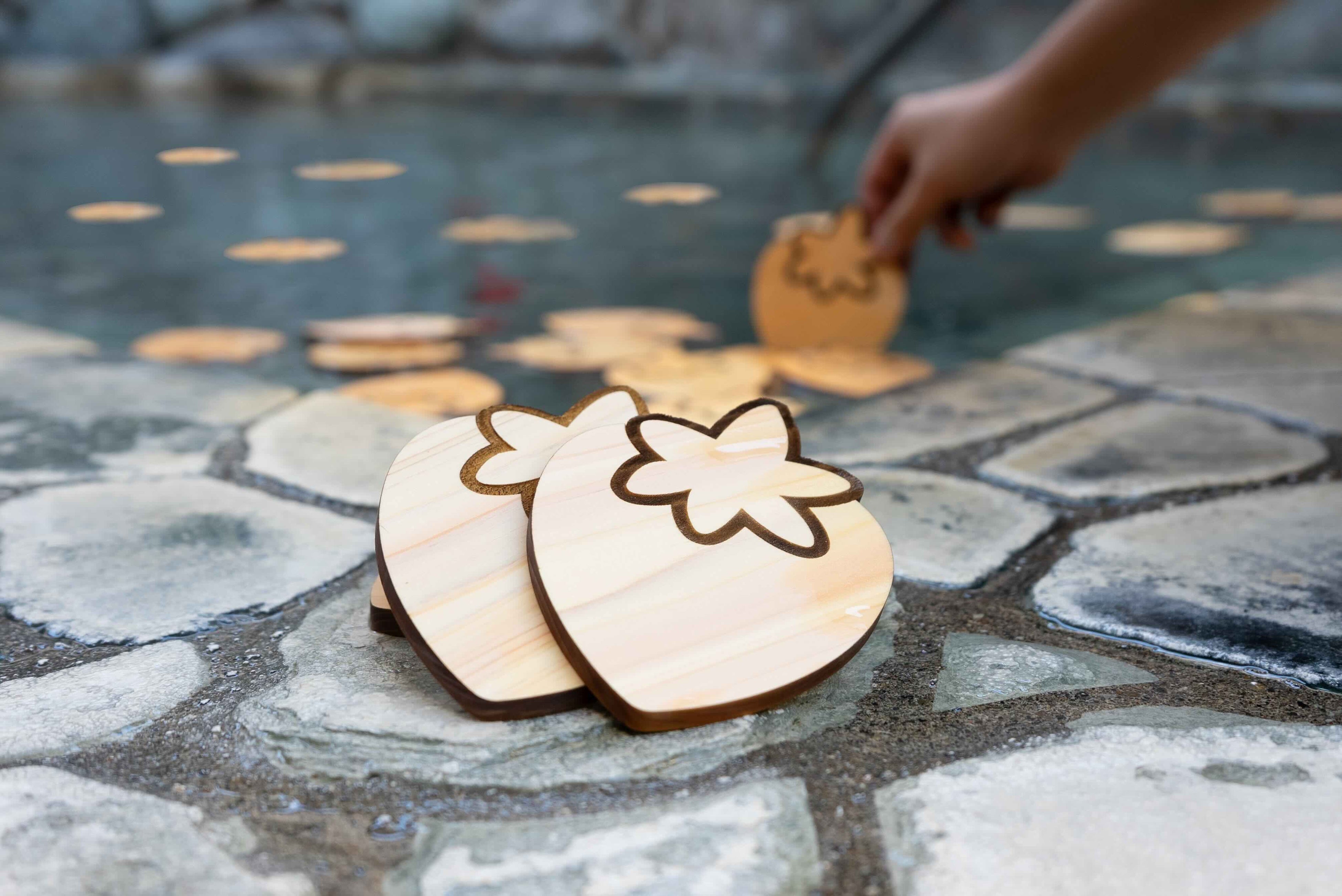 露天風呂に、いちご型のヒノキ入浴木を浮かべます。入浴木は世界遺産・熊野古道の森からのおくりもの「尾鷲ヒノキ」の間伐材を使用しています。爽やかな香りをお楽しみください。
