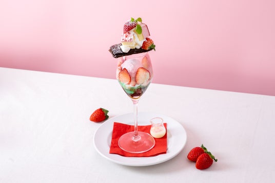 摘みたての生あまりん、ゼリー、アイス、ソース、ケーキの5種類のいちごデザート層が重なった、旬の季節にしか食べることができないスペシャルパフェです。