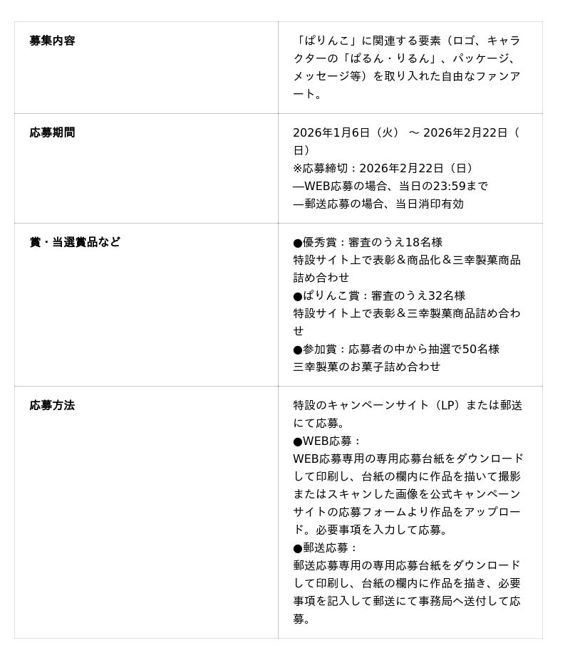 「みんなでつくるぱりんこコンテスト」では、消費者向けの募集と並行して三幸製菓の従業員および流通関係者からのアイデアも非公開で募集しています。幅広いステークホルダーの方々のアイデアを取り入れることで、「ぱりんこ」の未来をよりよく、より豊かなものにしてまいります。2026年秋頃には、各募集単位の受賞作品を反映した「共創デザインパッケージ」のぱりんこの発売や、ブランドサイト等での受賞作品の掲載も予定しています。