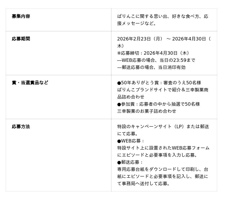 コンテスト特設サイト:https://www.sanko-seika.co.jp/parinko50thcontest/