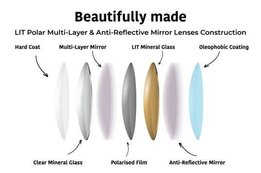 前述の通りOTISはすべてのレンズにミネラルガラスレンズを採用しています。このミネラルガラスレンズは傷に強く、長期間クリアな視界を維持。最高峰レンズとして位置づけられるLITレンズは偏光+マルチレイヤー構造反射を効果的に抑え、自然で快適な視界を実現します。アンチリフレクティブ & オレオフォビックコーティング反射防止・防汚性能を両立。