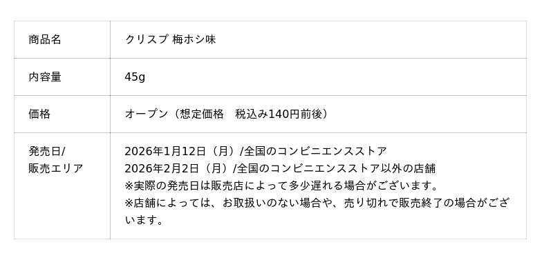 カルビー株式会社(本社:東京都千代田区、代表取締役社長兼CEO:江原 信)は、“ザクッ”とした食感が特長の成型ポテトチップス※1「クリスプ」から、梅の酸味を塩で引き立てた『クリスプ 梅ホシ味』を2026年1月12日(月)から全国のコンビニエンスストア先行で期間限定発売します。コンビニエンスストア以外の店舗では、2026年2月2日(月)から期間限定発売します(2026年6月中旬終売予定)。