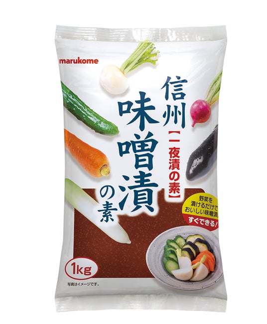 「信州味噌漬の素」は、信州赤系の米みそを使用した上品な甘みが特長の一夜漬け用みそです。塩分を控えめにし、従来の塩辛いみそにはない、ほどよい甘味のあるおいしい漬物に仕上がります。同商品は「大容量のタイプが欲しい」という声が多数寄せられ、あらたにラインアップしました。商品概要
