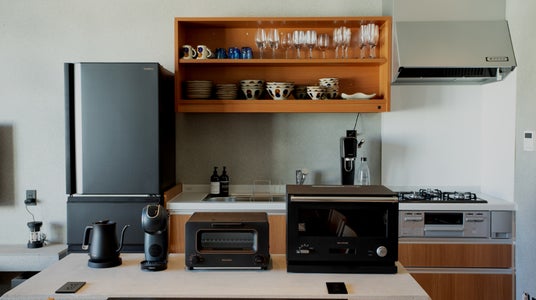 4.電化製品・アメニティまで細部にこだわり!沖縄らしい素朴な味わいの琉球風グラス・やちむんの食器のほか、高性能でデザイン性の高い「バルミューダ」家電をご用意しております。