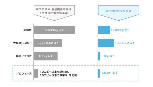※2 食品衛生法で定められた生食用牡蠣の規格基準は細菌に関する3種のみで、ノロウイルスは自主検査です。ゼネラル・オイスターのノロウイルス自社基準は、国が定める10.0コピー未満を陰性、10.0コピー以上を陽性という基準に対して、リアルタイムPCR法により4.5コピー以下としています。