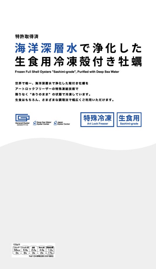 本商品は、当社が特許技術として保有する海洋深層水による牡蠣の浄化技術と、最新の冷凍技術を掛け合わせたもので、海洋深層水で浄化した生食用殻付き牡蠣を冷凍食品として商品化するのは業界初となります。