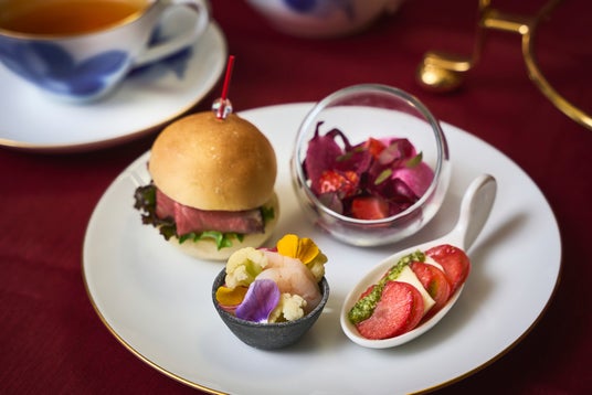 (セイボリー)ミニバーガー ローストビーフ イチゴバルサミコ/海老とカリフラワーのタルトレット/いちごとトマトのカプレーゼ/いちご ビーツ オリーブのサラダ/プレーンスコーン・いちごスコーン(自家製いちごジャム・クロテッドクリーム)