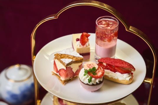 旬を迎える苺の魅力を存分に堪能する、華やかなアフタヌーンティーが登場します。グラスの中で美しい層を織りなすヴェリーヌや、サクサクのパイ生地が香るミルフィーユ、見た目もかわいいチョコレートフランなど、濃厚なものからさっぱりとした味わいまで、9種類のスイーツが彩り豊かに並びます。セイボリーには、ローストビーフを使ったミニバーガーやカプレーゼなど、苺の爽やかさを活かした4種類をご用意します。ひと口ごとに広がる苺の芳醇な香りと甘酸っぱさをお楽しみいただけます。ホテルのティーラウンジで、春の訪れを告げる苺づくしの優雅なひとときをお過ごしください。