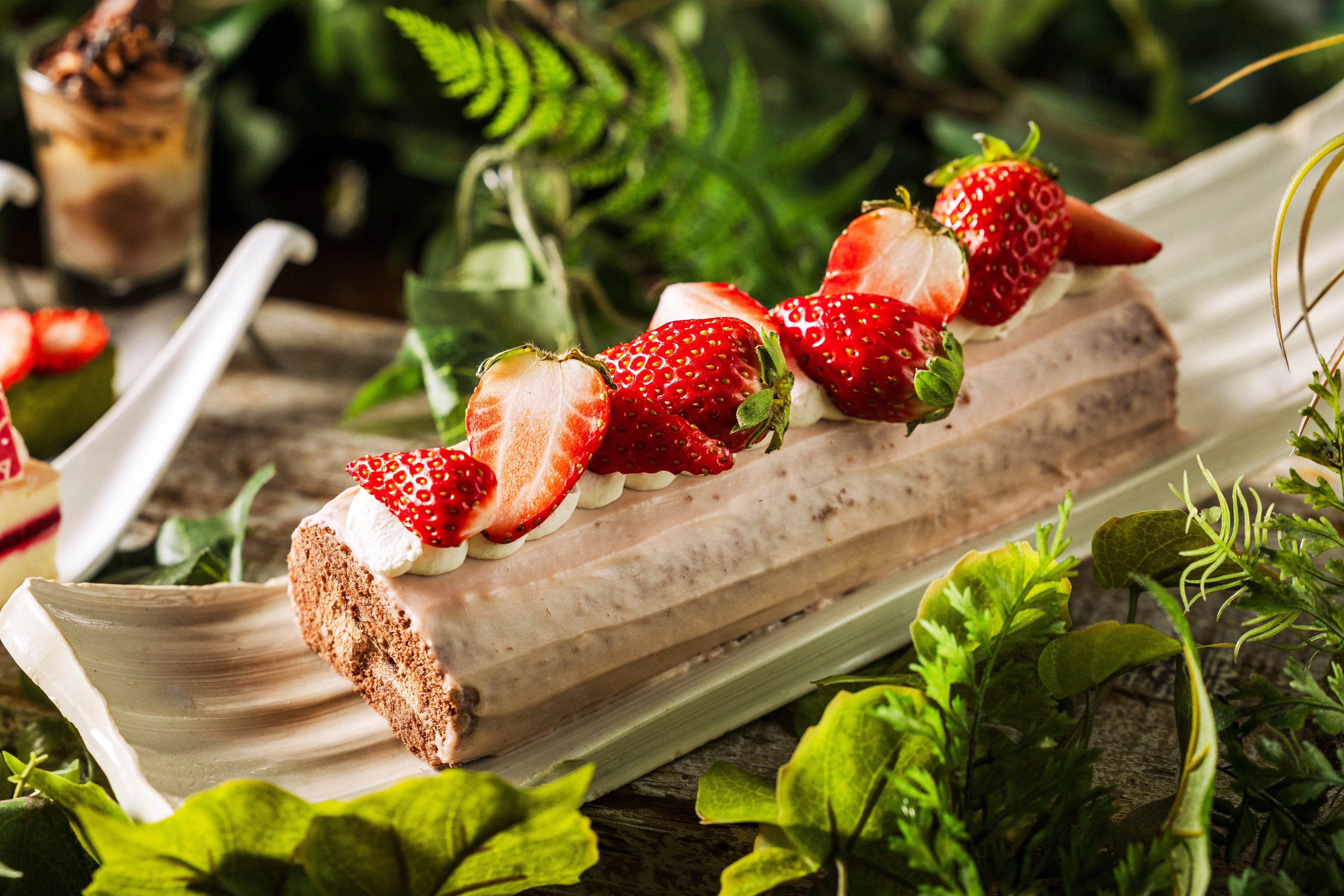口に運ぶたびに広がる甘酸っぱさとチョコレートの奥深い風味が、冬の特別なひとときを演出します。そのひとときを包み込むように、グリーンあふれる空間が、ひと足早い春の気配を添えます。