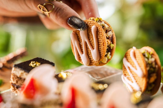 濃厚なチョコレートガナッシュをサクサク食感のクッキーでサンドし、側面にはヘーゼルナッツとピスタチオをあしらいました。ナッツの香ばしさとほどよい歯ごたえが、チョコレートのコクを引き立てます。