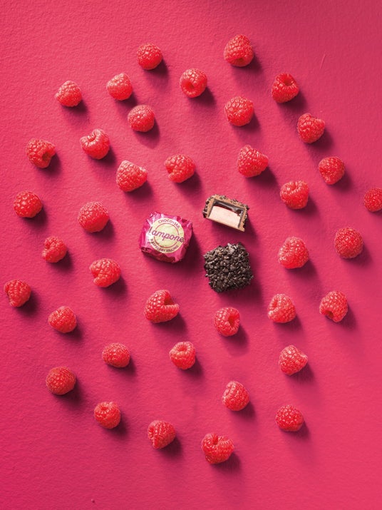 濃厚なラズベリーフィリングとラズベリーソースを重ね、ダークチョコレートシェルで包んでチョコビア75%グレインをまぶしました。ラズベリーの酸味がダークチョコレートと絶妙に調和し、クリーミーなラズベリーフィリングの甘さをバランスよく引き立てます。
