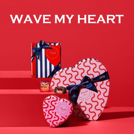 ハート ギフトボックス ウェーブマイハート 7,560円(税込)愛溢れる季節にぴったりのハート型のギフトボックス。ふたを開くと現れる16種類20個のイタリアンチョコレート。Venchiこだわりのコレクションを堪能していただけるアソートです。