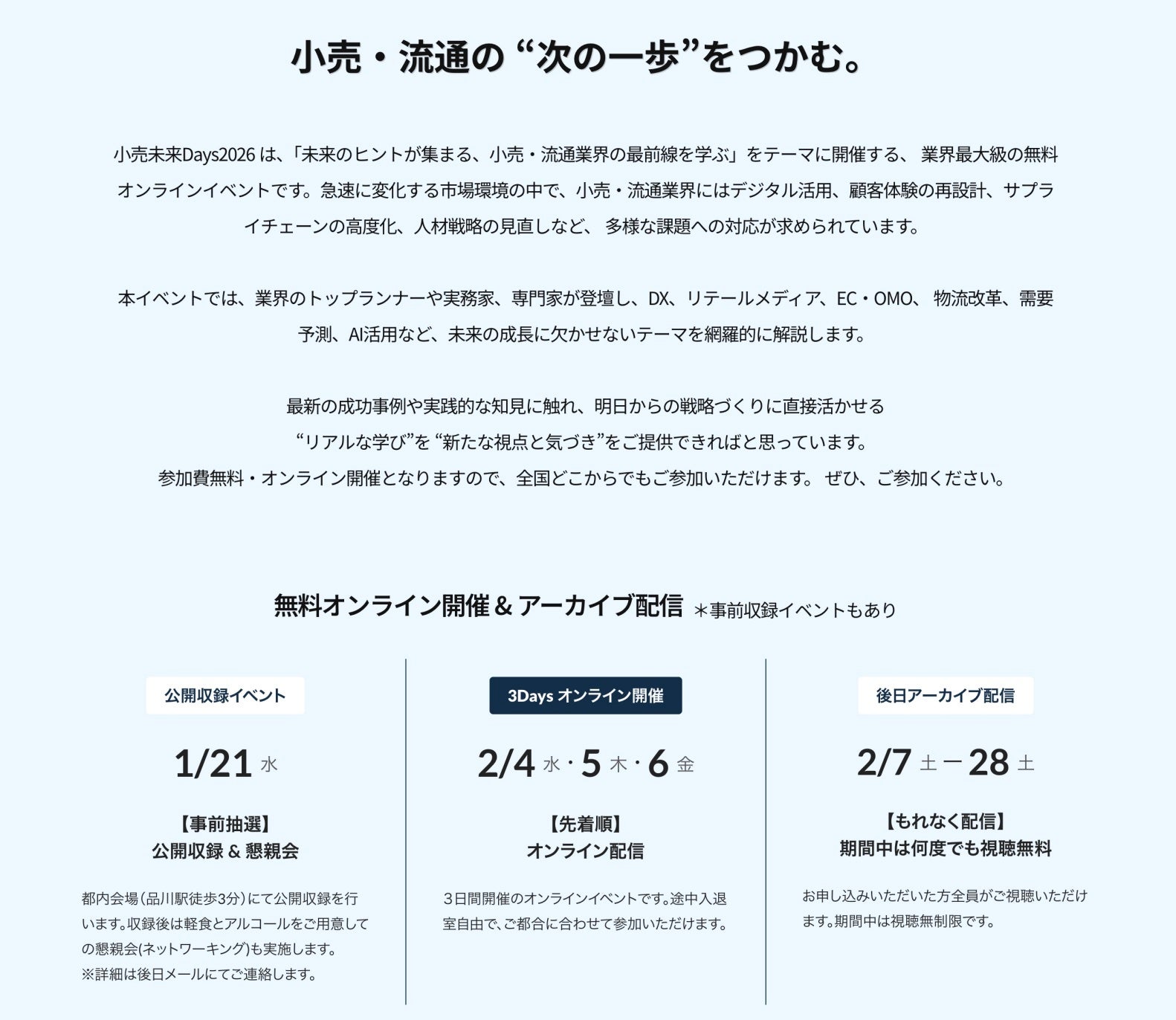 小売未来Days2026 は「小売・流通業界の課題解決を支援し、最新の成功事例や実践的な知見に触れる場」をテーマに開催する、 業界最大級の無料オンラインイベントです。