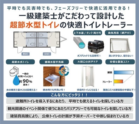 さらに、超節水機能と給排水タンクによって断水時でも自立稼働し、迅速に被災地へ移動して衛生的な避難所トイレとして機能する点が特徴である。トレーラー型の可搬性により、トイレ整備が困難だった地域にも展開でき、非常時特有のトイレ問題の解決にも寄与する。日常と災害の双方で、快適性と衛生環境を守るフェーズフリーな社会インフラとして、幅広い活用と普及が期待される。