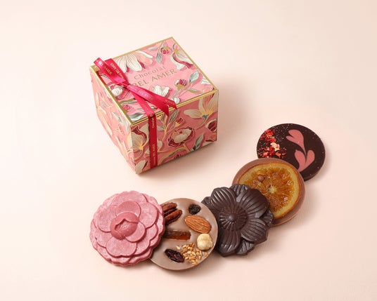 フラワーモチーフやハートプリントなど、華やかなデザインを取り入れた期間限定の板チョコレートギフト。上質なチョコレートに、可憐なデザインと多彩なフレーバーを組み合わせました。一枚ごとに異なる味わいと表情が楽しめる、ギフトにもぴったりのショコラコレクションです。