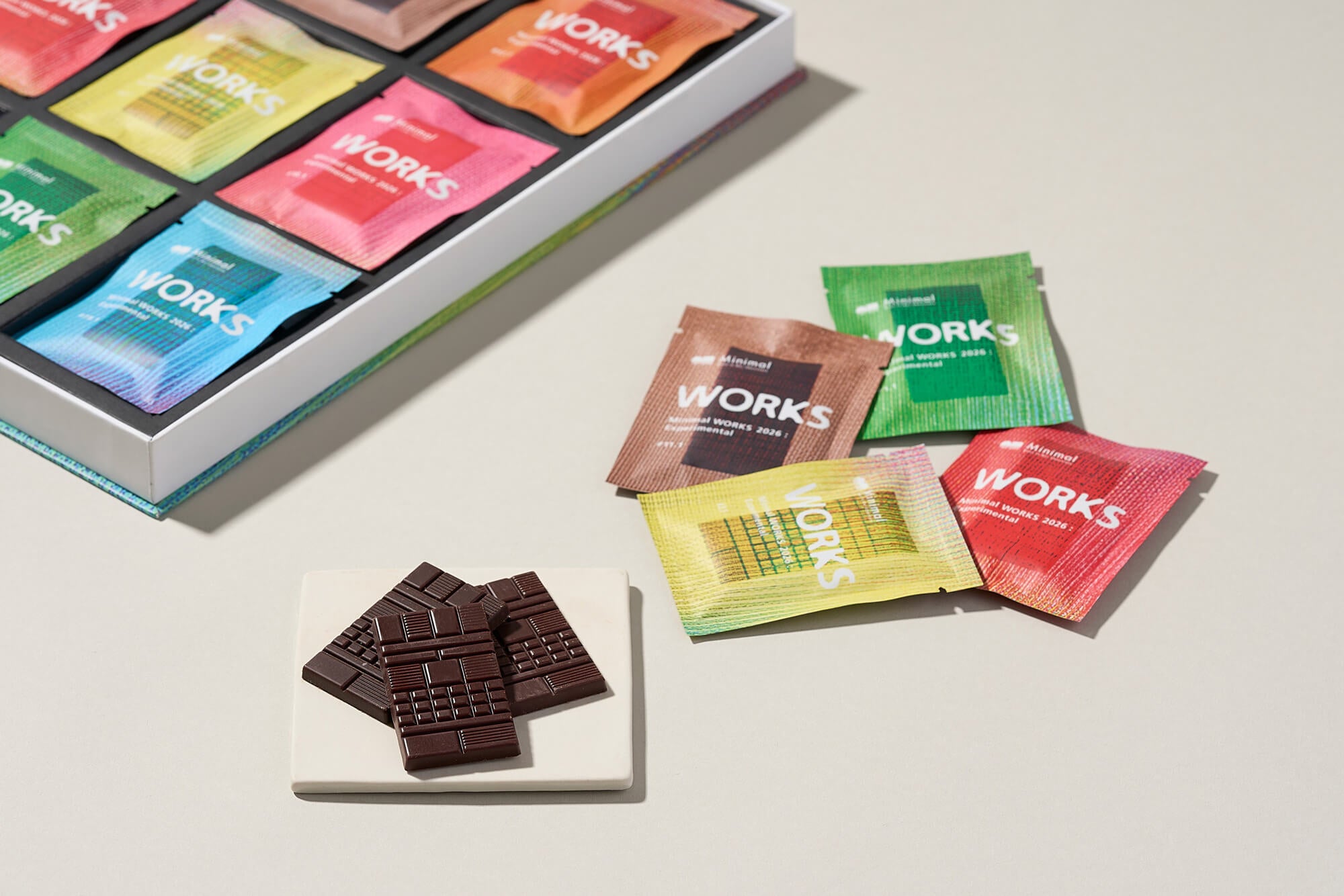 「Minimal WORKS」シリーズは、1年に一度、その年のテーマを掲げておつくりする、“職人たちの作品集(Works)”をコンセプトとした、9種の板チョコレートのアソートセットです。今年のテーマは「Experimental」。
