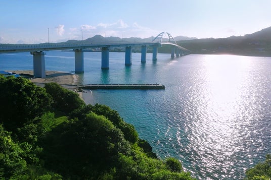 崖を切り開き、海岸線へと導かれるアプローチの先には、緑の植生と岩肌、そして視界いっぱいに広がるパノラマのオーシャンビューが現れ、沖縄本島へと続く橋の景観が重なります。
