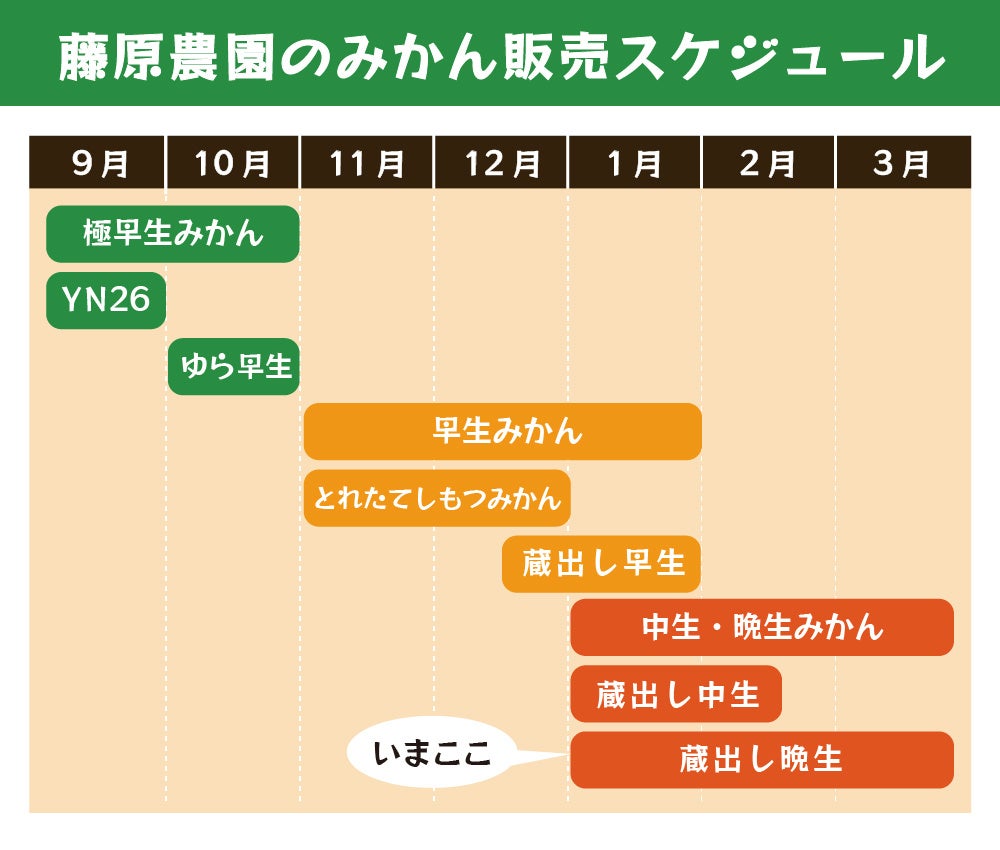 また品種改良により古くは下津町で宮本早生が生まれ、9月からみかんを出荷できるようになり、今では和歌山県で生まれたYN26やゆら早生など、9月や10月でも食味のよいみかんを出荷できるようになっています。