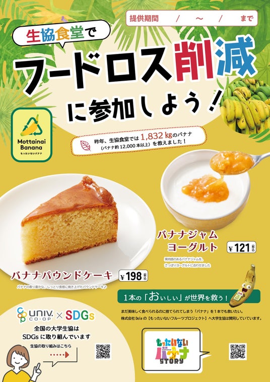 第二弾となる今回は「生協食堂でフードロス削減に参加しよう!」をテーマに、果肉感のあるバナナジャムを、さっぱりヨーグルトに合わせた「バナナジャムヨーグルト」と、昨年に引き続き「バナナパウンドケーキ」の2品が、北海道大学や東北大学、東京大学、名古屋大学など、東日本エリアの、のべ85大学164店舗で提供されます。販売期間は、2026年1月12日(月)から1月24日(土)までを予定しています。