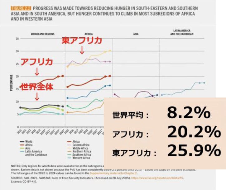 国際連合食糧農業機関(FAO)などが2025年7月に発表した「世界の食料安全保障と栄養の現状」最新報告書では、飢餓の状況は地域による格差が広がっています。世界全体では改善の兆しがみられる一方で、アフリカでは飢餓が依然として増加。人口の20.2%・5人に1人が飢餓に直面しており、この割合は他の地域よりも圧倒的に高い状況です。TFTの主な支援先である東アフリカは、25.9%とアフリカの中でもさらに高い水準となっています。