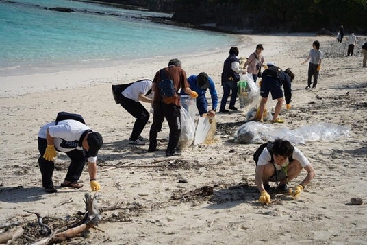 コープデリグループでは、「美ら島応援もずくプロジェクト」の一環として「産地交流・研修会」を実施しています。これまでに300人を超える役職員・組合員が伊平屋島を訪れ、伊平屋島産もずくに関する学習会やもずく漁場の見学、もずくの選別・異物除去体験、海岸に漂着するゴミの清掃活動(写真)などを通して、商品や環境保全への理解を深めています。