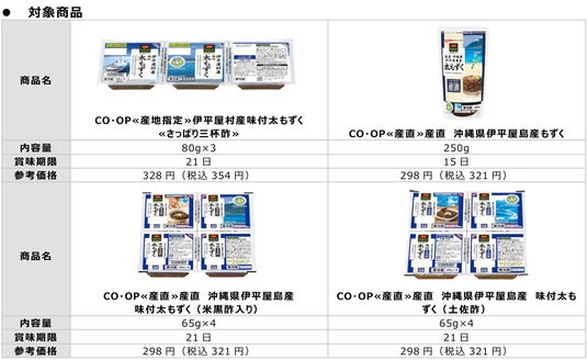※コープデリ連合会では「CO・OP≪産地指定≫伊平屋村産味付太もずく≪さっぱり三杯酢≫」、「CO・OP≪産地指定≫沖縄県伊平屋島産味付もずく(三杯酢)」の取り扱いはありません。