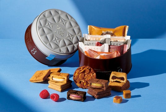 3種のバターサンドとバターフロランタン、バターサブレ〈キャラメル〉、プレスバタークッキーを「2026 アムール・デュ・ショコラ~ショコラ大好き~」限定のオリジナル缶に閉じ込めました。PRESS BUTTER SANDのグレーとチョコレートを想起させるブラウンの2色を基調に、蓋部分はバターサンドのシンボルマークのエンボス加工を施した、高級感のある仕様です。6つの異なる美味しさを心ゆくまで味わえる、贅沢なアソートセットをお楽しみください。