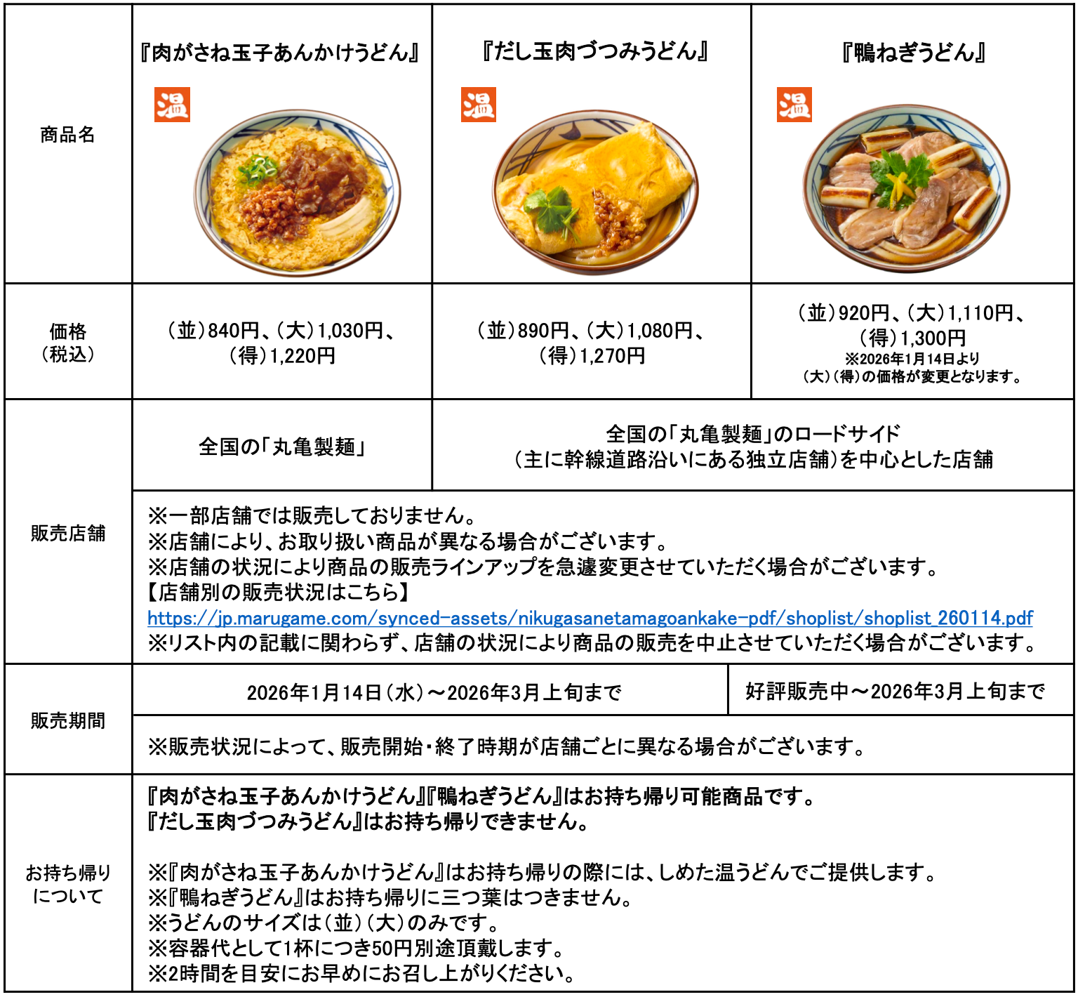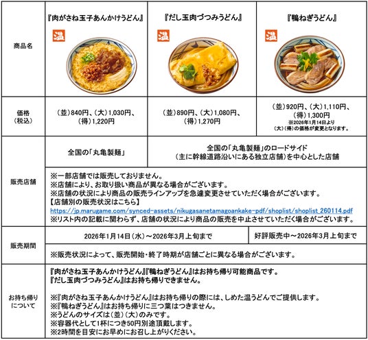株式会社丸亀製麺(本社:東京都渋谷区、代表取締役社長:山口 寛)が展開する、食の感動体験を探求し、手づくり・できたてにこだわる讃岐うどん専門店「丸亀製麺」は、『肉がさね玉子あんかけうどん』を2026年1月14日(水)より全国の丸亀製麺にて期間限定で販売します。また、同日より『だし玉肉づつみうどん』を全国のロードサイド店を中心に販売開始いたします。また2025年11月末より好評販売中の『鴨ねぎうどん』も継続販売します。