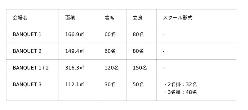 会議やセミナーはもちろん、プロジェクトのキックオフや懇親会、展示会、プレスイベント、ウエディングの二次会まで幅広く対応するバンケットフロア。3つの会場は用途に応じて使い分けが可能で、バンケット1・2は連結利用にも対応します。全会場に100インチフルHDプロジェクターを備え、飲食を伴う催しにも柔軟に対応。