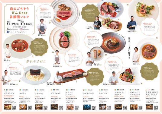 首都圏の10店舗にて、岐阜が誇る極上の本州鹿を堪能できる「森のごちそう ぎふDeer首都圏フェア」を開催中。シェフたちが素材の魅力をいかした、多彩な“ぎふジビエ”メニューをご用意しています。特別な美味しさをぜひお楽しみください。なお、開催期間は1月31日(土)まで。