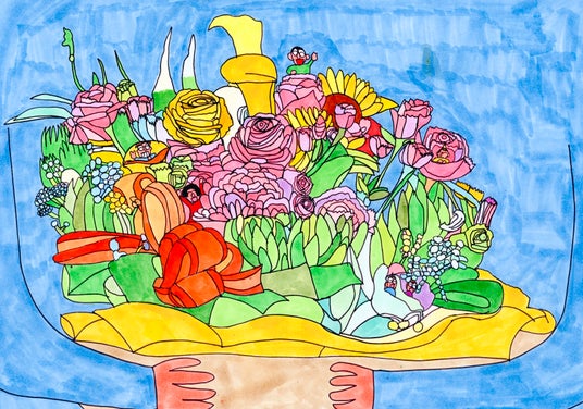 生まれて初めてもらった花束を記憶に残しておきたくて描きました。