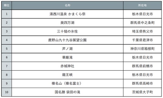 冬は澄んだ空気と静寂が生み出す絶景の宝庫!各地で見応えある冬絶景がたくさん見られます。今回は、関東エリアで楽しめる冬ならではの絶景スポットについてアンケート調査を実施しました。“幻想的”だと思う絶景スポット第1位に選ばれたのは、栃木県日光市「湯西川温泉 かまくら祭」でした。日本夜景遺産にも認定された幻想的な夜景と雪国ならではの体験が楽しめるイベントです。第2位には、群馬県中之条町「奥四万湖」がランクイン。静寂に包まれる奥四万湖で雪景色と際立つ四万ブルーが満喫できます。続く3位は埼玉県秩父市「三十槌の氷柱」で、天然の氷柱の毎年姿が変わる自然の造形美が魅力のスポットです。そのほか、旅行情報サイト『じゃらんニュース』では、TOP10以外にも関東エリアのおすすめ冬絶景スポットを多数紹介しています。(【関東】冬絶景16選:https://www.jalan.net/news/article/212851/)