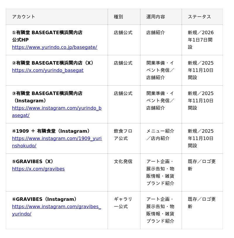 開業に先立ち、「有隣堂 BASEGATE横浜関内店」および各店舗の公式ホームページならびにSNSアカウントを順次開設し、イベント情報や店舗コンテンツ、空間の魅力を継続的に発信してまいります。