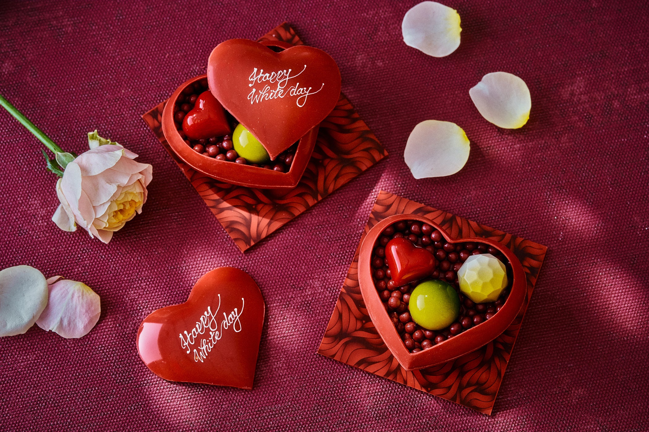 昨年ご好評をいただいたホワイトとピンクのマーブル模様が美しいマカロンが今年も登場。サクっとした食感の生地でなめらかなガナッシュをサンドし、パール感のあるハート型のホワイトチョコレートをデコレーションします。ローズ、ストロベリー、バニラと、1箱で3つのフレーバーをご堪能いただける、見た目も味わいも華やかなアイテムです。