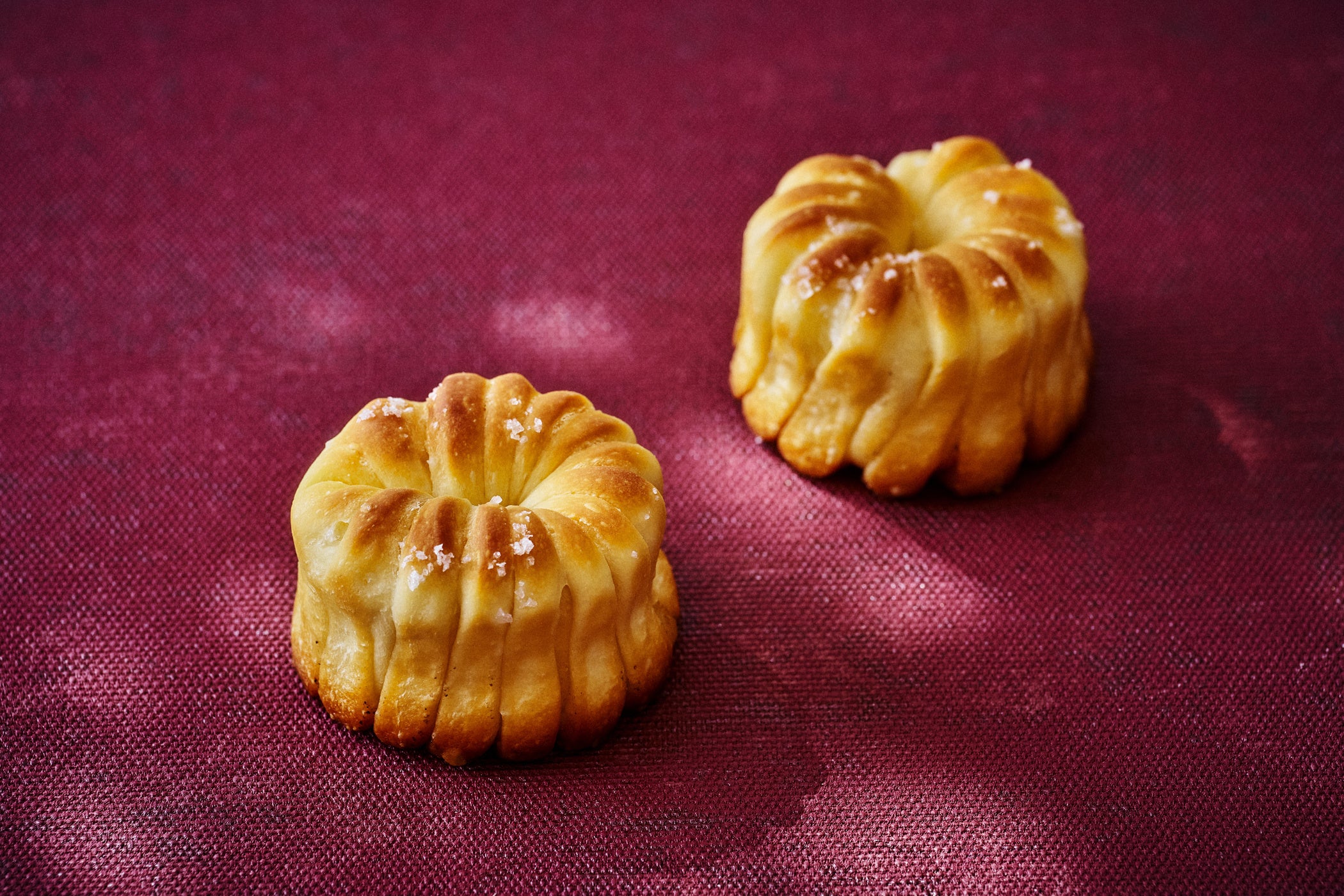 ミルクロール生地にホワイトチョコレートとバターを合わせる、やさしい味わいの新作ブレッドです。生地に切り込みを入れて巻くことで、春の花のような可愛らしいシルエットに焼き上がります。トップの岩塩が、ホワイトチョコレートのまろやかな甘みとバターのリッチな味わいにアクセントを加えます。