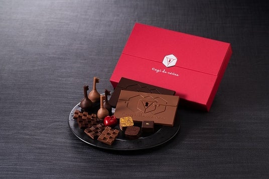 ブランドを代表するギフト。カカオ分の異なるノワールとオレを市松模様に組み合わせ鍵穴をデザインした「プチダミエ」をはじめ、 カカオ分41%と64%の2種類のタブレット、キャギ ド レーブのブランドロゴマークの入った「ナチュール」、「ヴーヴクリコロゼ」、「グランマルニエ」、「シャンパンフランボワーズ」のボンボンショコラ、 なめらかな口どけのガナッシュを薄いシェルで包んだ鍵型フォルムが珍しい「クレ ド トリュフ」の全12種類のキャギ ド レーブの代表的商品を集めたバラエティに富んだ贅沢なコフレ。