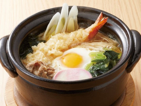 ■鍋焼きうどん 1,230円(税込)湯気が立ち上る関西風かつおだしに、大海老天、牛肉、玉子、白ネギをのせた王道の「鍋焼きうどん」は、この季節にぴったりの一品です。