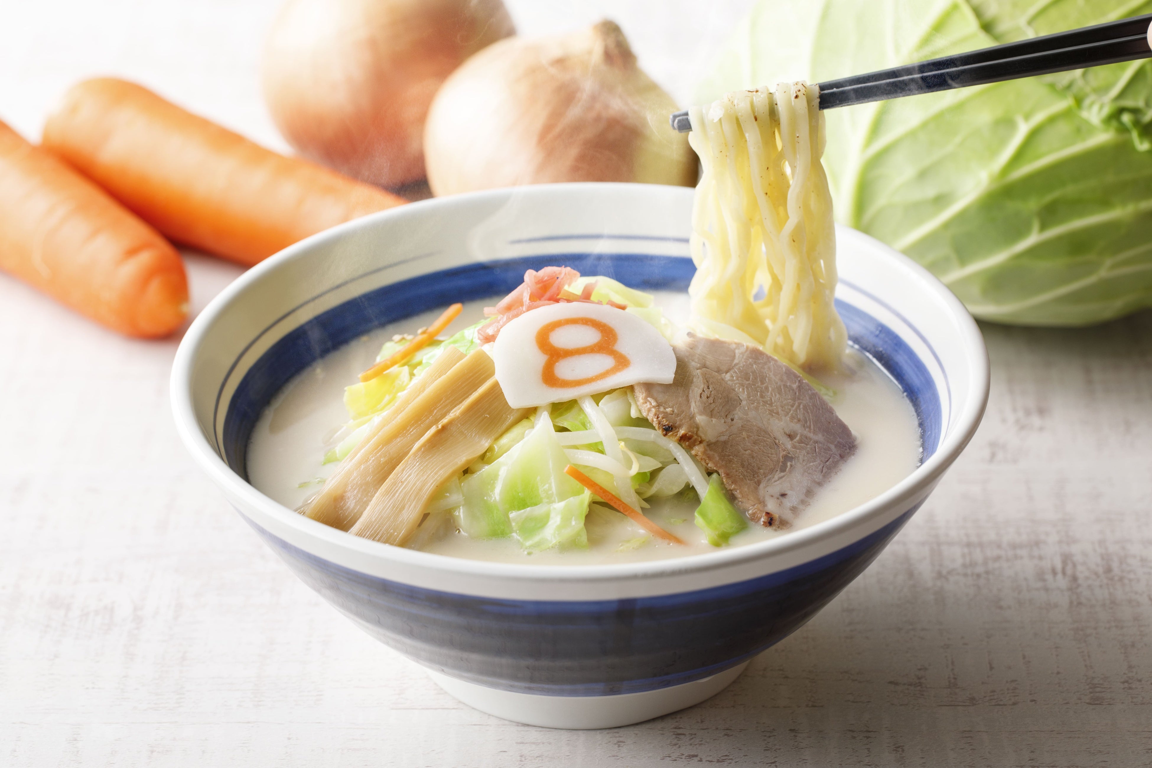 1967年に創業し、「野菜らーめん」が定番の「8番らーめん」を展開する株式会社ハチバン(本社:石川県金沢市、代表取締役社長:長丸 昌功)は、あったか白スープが主役の“白い8番祭”と題して、3週連続で期間限定商品を販売いたします。第1弾は、お客様の声にお応えし、4年ぶりに「野菜とんこつらーめん」を1月19日(月)から期間限定で販売いたします。第2弾は、一昨年好評いただいた「ちゃんぽんらーめん」を1月26日(月)から、第3弾は、新商品「豚バラなんこつ煮らーめん」を2月2日(月)から、順次期間限定で販売いたします。