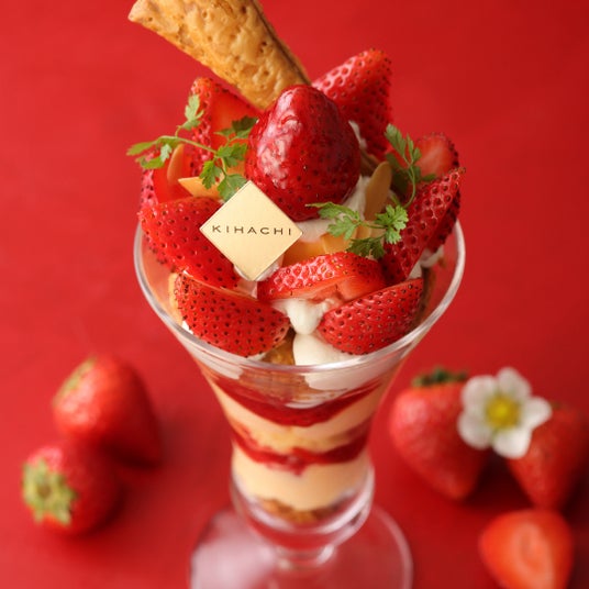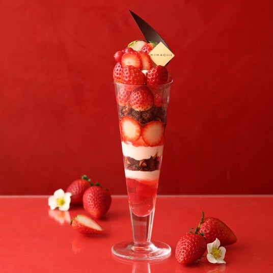 国産苺、苺アイス、フランボワーズ・マスカルポーネクリームなど何層にも重ねた「苺のパフェ」と日比谷シャンテ限定の「あまおう苺のナポレオンパフェ」、2つのパフェをメインに、シグネチャーの「KIHACHIのナポレオンパイ」、たっぷり苺を添えた「苺のクレープ バニラアイス添え」、ほろ苦いカカオの風味が苺の甘酸っぱさを引き立てる「苺のショコラショートケーキ バニラアイス添え」など、個性豊かな苺スイーツが全店に登場します。