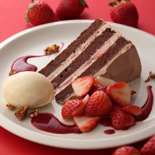 ショコラのクリームとスポンジを重ね、苺をサンドしたシンプルなショートケーキ。ほろ苦いカカオの風味と甘酸っぱい国産苺の相性が抜群です。