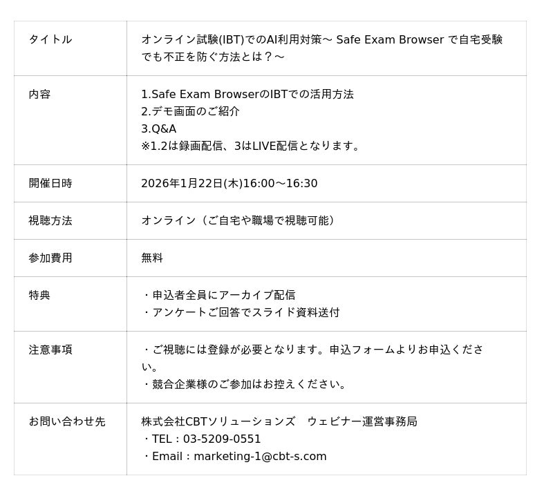 CBT・IBT試験等の試験運営業務をメイン事業とする株式会社CBTソリューションズ(本社:東京都千代田区、代表取締役社長:野口功司)は、2026年1月22日(木)に無料セミナー「オンライン試験(IBT)でのAI利用対策~ Safe Exam Browser で自宅受験でも不正を防ぐ方法とは?~」を開催いたします。