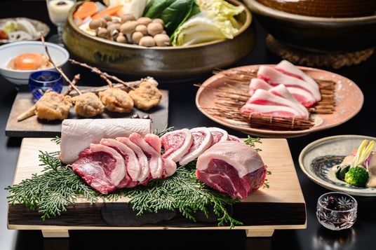 本コースの主役は、市場流通が極めて少ない幻の篠山産天然小猪肉と、きめ細かな脂と旨みを誇る天然最上級ロース肉。
