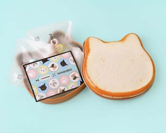 「ねこねこ食パン」の形とデザインをそのまま再現した、ファン必見の特別仕様キャンディ缶に、PAPABUBBLE限定の「こねこミックス ブルー」キャンディ2袋と、今回のコラボのために描き下ろした限定ステッカー1枚をセットしました。