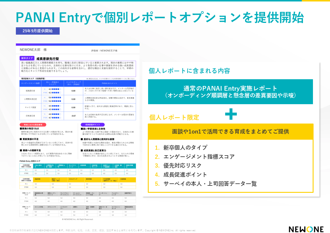 エンゲージメント向上を軸とした組織開発・人材育成コンサルティング支援を通して“推せる職場づくり”を進める株式会社NEWONE(本社:東京都港区 代表取締役:上林 周平、https://new-one.co.jp/ 以下、NEWONE)は、育成担当者が、新入社員一人ひとりの状態を客観的に捉え、「根拠ある対話」を可能にするための新プログラムとして、PANAIサーベイの個別レポートを活用した育成担当者(以下、OJTトレーナー)研修の提供を開始しました。