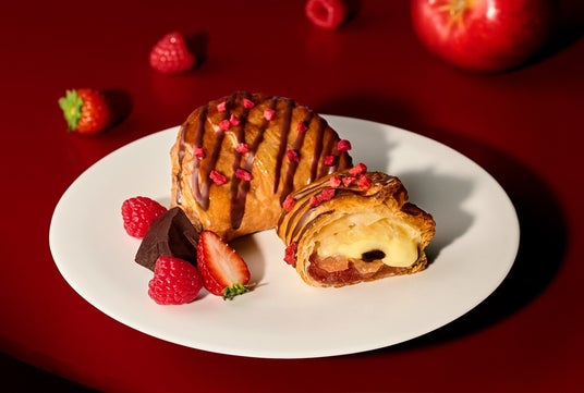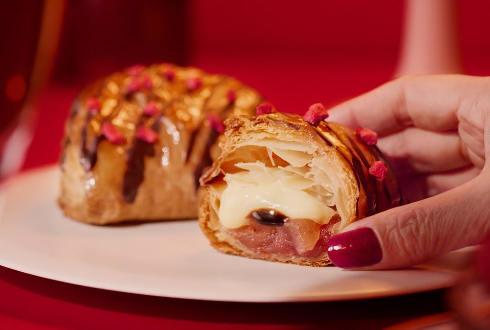 「焼きたてカスタードアップルパイ ダブルベリーショコラ」は、甘酸っぱいストロベリーとラズベリーの“ダブル”ベリーにビターなチョコレートをあわせたアップルパイ。大人っぽく上品なバレンタイン気分を演出する仕上がりです。